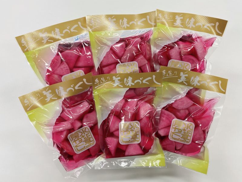 山形県産の赤かぶを使用、保存料・着色料などは使用せず醸造酢等で工夫し漬け込んだ自然色品です。